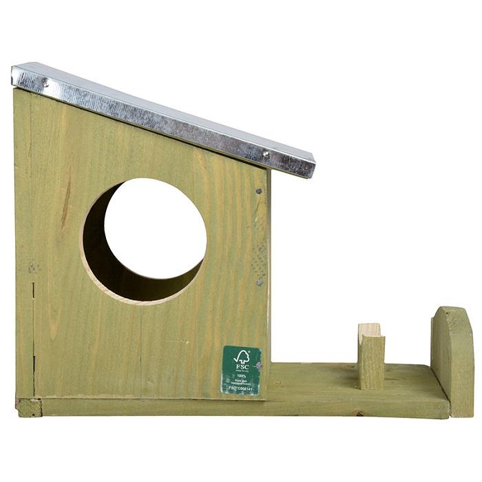 Dit eekhoorn pindakaas voederhuis van het merk Esschert Design is, zoals de naam al zegt, een voedersysteem om eekhoorns pindakaas te kunnen voeren. Pindakaaspot niet inbegrepen. U legt aan de buitenzijde van het voederhuisje een geopende pot pindakaas met de open zijde van de pot naar het huisje gericht en vervolgens kan de eekhoorn zelf in het huisje kruipen om van de pindakaas te snoepen. Doordat de pindakaaspot aan de buitenzijde ligt kunnen zowel u als de eekhoorns de pindakaas zien, u kunt zo gemakkelijk zien hoeveel pindakaas er nog in de pot zit. Door middel van de ingangsgaten kan de eekhoorn het huisje betreden en kunt u de eekhoorn zien zitten. Door het dichte gedeelte zit de eekhoorn direct beschut tegen vijanden. Eekhoorns zijn gek op pindakaas. Door middel van dit pindakaas voederhuis, zekers als u in een bosrijke omgeving woont, zult u eekhoorns aantrekken naar uw tuin. U kunt het eekhoorn pindakaas voederhuis eenvoudig in uw tuin ophangen aan een boom, schutting of muur door het voorgeboorde gat in het houten frame. Het voederhuis is gemaakt van FSC-gecertificeerd vurenhout en heeft een zinken dakje. Helaas sterven er nog steeds eekhoorns of kunnen zijn niet nestelen door onvoldoende voedsel, met behulp van het eekhoorn voederhuis helpt u de eekhoorns in Nederland een handje. Naast dat u de eekhoorn helpt met dit speciale pindakaas voederhuis zorgt u er tegelijkertijd voor dat eekhoorns minder snel zullen snoepen van de vogelvoeders/vogelvoederhuisjes in uw tuin!U maakt extra kans eekhoorns naar uw tuin te trekken en te behouden als u naast het eekhoorn pindakaas voederhuis ook een eekhoornhuis ophangt waarin de eekhoorn kan overwinteren, nestelen of als beschermplaats kan dienen tegen marters, roofvogels, honden of katten. Een eekhoorn kan tot 8 jongen krijgen welke rond maart/mei geboren, indien er voldoende voedsel is. Als er onvoldoende voedsel aanwezig is worden de jongen rond juli/september geboren. Na ongeveer 8 weken zijn de jongen buiten het nest te zien. Gebruikersvoordelen: FSC-gecertificeerd vurenhout Natuurlijke uitstraling Aantrekken en behouden van eekhoorns in uw tuin