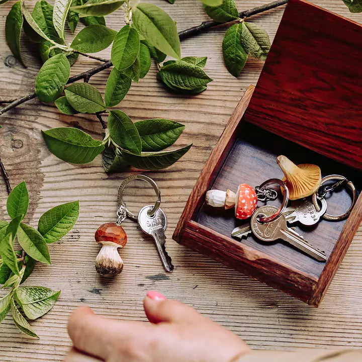De hanenkam-sleutelhanger is een praktisch en charmant accessoire dat u helpt bij het ordenen van uw sleutels. Het levensechte cantharelmotief is met de hand gesneden en met de hand beschilderd in milieuvriendelijke kleuren. Hier hebben onze ervaren ambachtslieden een praktisch alledaags item gemaakt met ongelooflijke details die de speelse vormen van de natuur weerspiegelen.