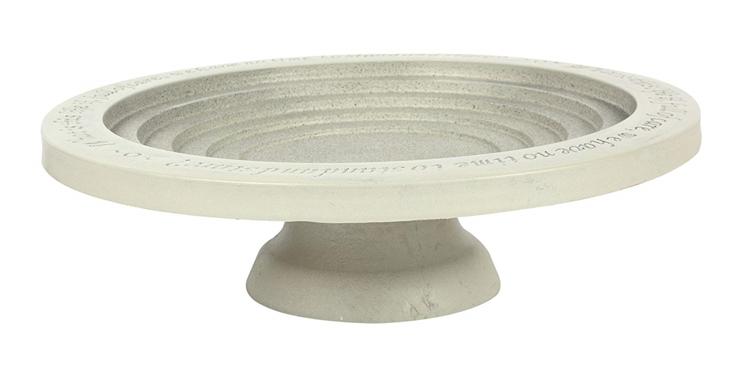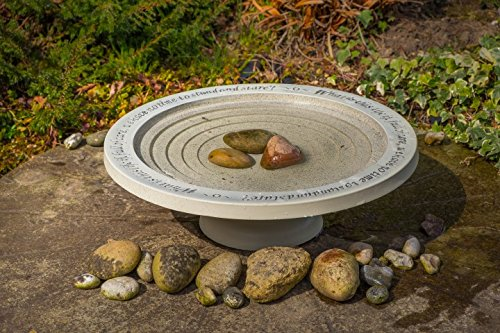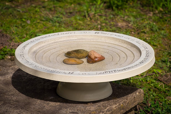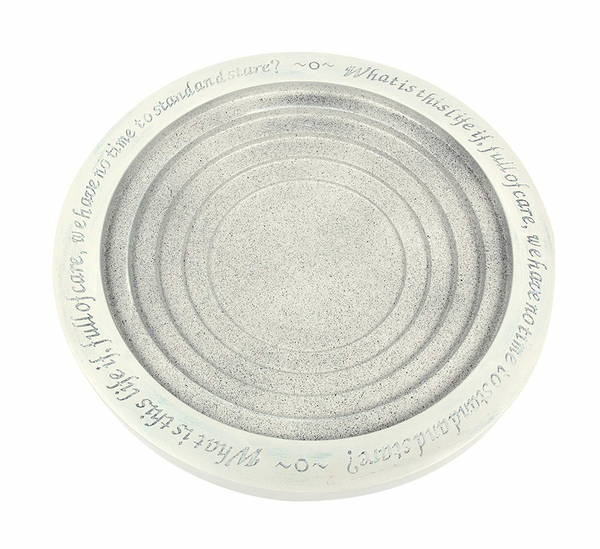 Onze Shenstone Theatre Vogelbad en drinkbak is de perfecte tuinfunctie voor vogels en andere dieren in het wild. Het theaterstapontwerp zorgt voor veilig drinken, niet alleen voor vogels, maar ook voor andere bestuivers en insecten die graag van de ondiepe randen van zwembaden nippen. Het bad wordt geleverd met een kort basisgedeelte waardoor het ongeveer 10 cm boven het maaiveld komt. Het is in reliëf gemaakt rond de rand van het vogelbad met de openingsregels van het bekende vers uit het gedicht 'Leisure' van WH Davies. 'Wat is dit leven als we, vol zorg, geen tijd hebben om op te staan.