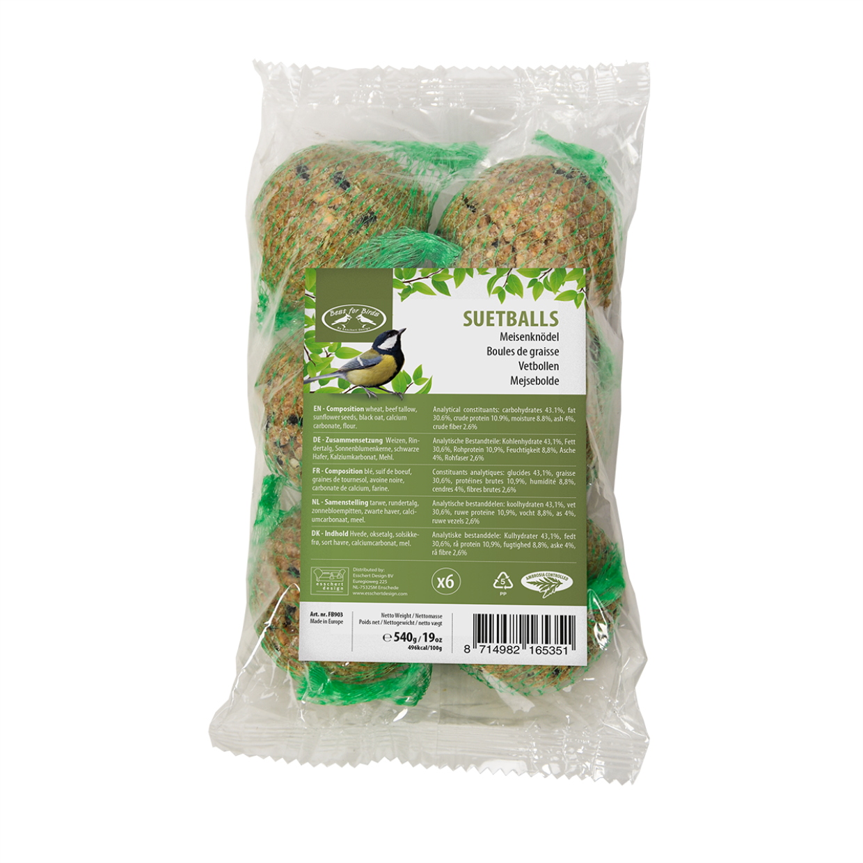 - Rundertalg, tarwe, maïs, sorghum, gestreepte zonnebloempitten, calciumcarbonaat