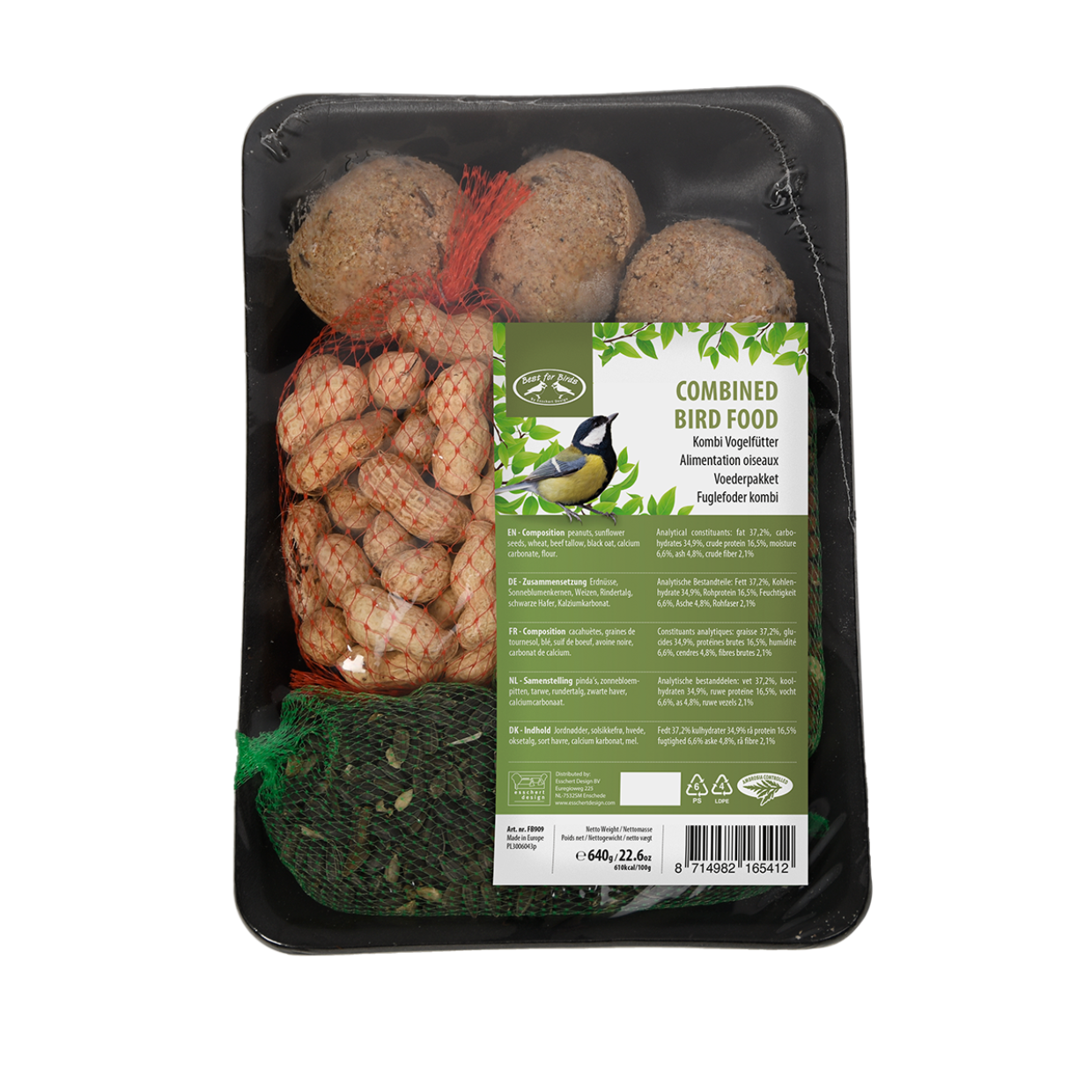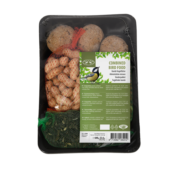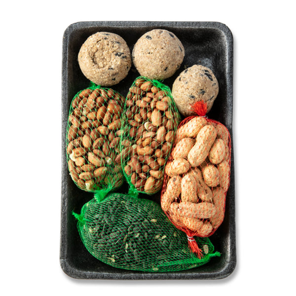 Verwen de vogels met verschillende lekkernijen. Dit wintervoerpakket bestaat uit 3 vetbollen, 2 pindanetjes, 1 netje met zwarte zonnebloempitten en 1 netje met doppinda's.