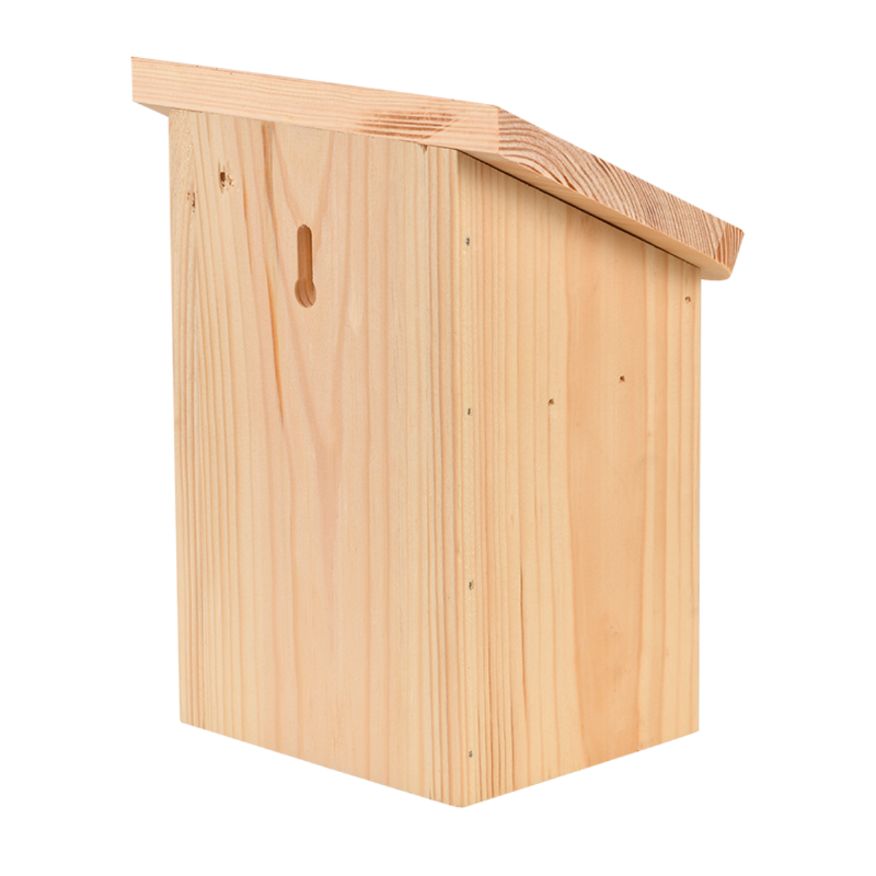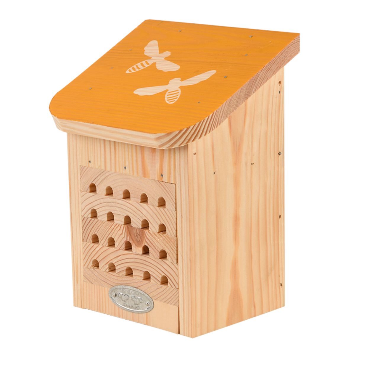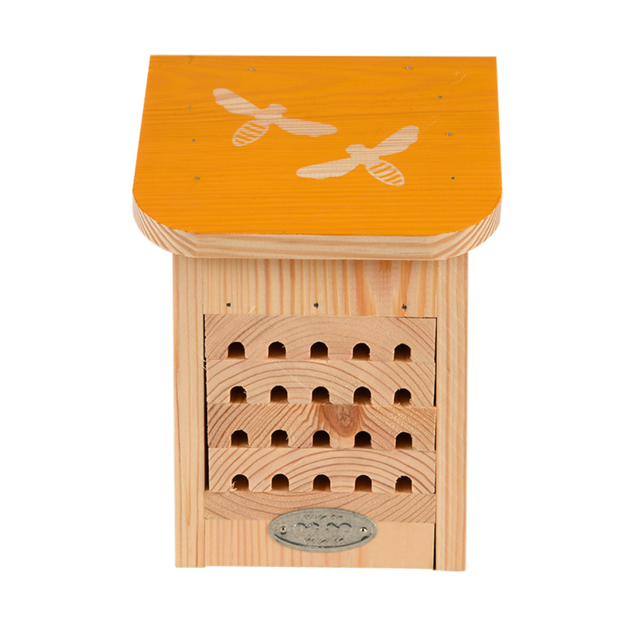 Vele wilde bijensoorten worden bedreigd door de achteruitgang in flora en nestgelegenheden. Dit bijenhuis is voorzien van vier houten trays die verwijderd kunnen worden voor inspectie of om schoon te maken. Het gaten in het bijenhuis trekken solitaire bijen aan waardoor diverse soorten wilde bijen hier kunnen nestelen. Een vrouwtjesbij maakt in een gat verschillende cellen met een eitje en wat pollen en nectar voor de larve.- gekleurd dak met silhouet
