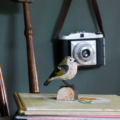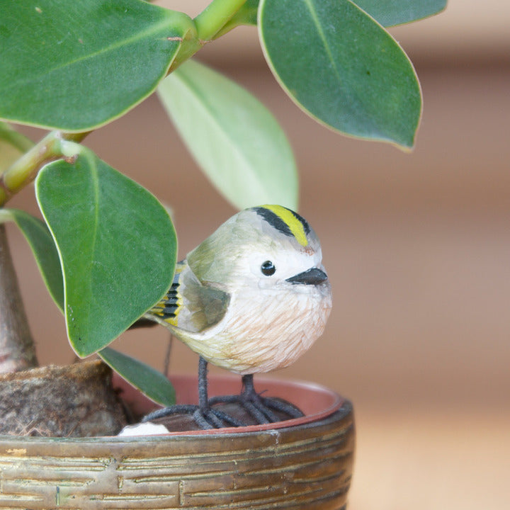 Dit is een natuurgetrouwe weergave van een dwergje onde de vogels: het Goudhaantje. Het kleine ronde vogeltje is vertederende verschijning maar is moeilijk waarneembaar omdat hij zich messtal ophoudt in de boomtoppen. Met de ambachtelijk gesneden en geschilderde DecoBird Goudhaan heeft u een exemplaar waar u dagelijks van kunt genieten.