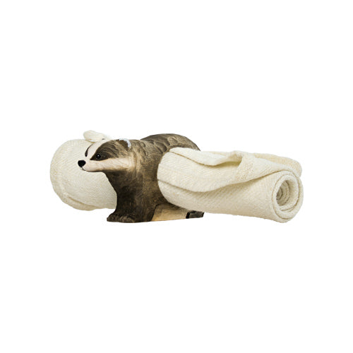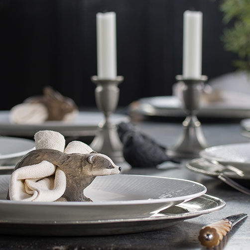 Beroemd om zijn zwart-witte strepen, stevige lichaam en stevige voorpoten, brengt een team van bekwame ambachtslieden de iconische das tot leven in onze houten servetringen. Het met de hand gesneden lindehout geeft perfect de korte, sterke benen en het lange lichaam van de das weer en het opvallende zwart-witte gezicht wordt gevangen door de met de hand geschilderde details, allemaal in niet-giftige acrylverf. De gitzwarte glazen ogen geven de das een authentieke uitstraling als hij vanaf de tafel naar je opkijkt. Bovendien leent de organische uitstraling, in combinatie met trendy zwart-wit tinten, zich uitstekend voor vrijwel elke servettint. Het 3,5 cm brede middengat is geschikt voor zowel papieren als stoffen servetten.