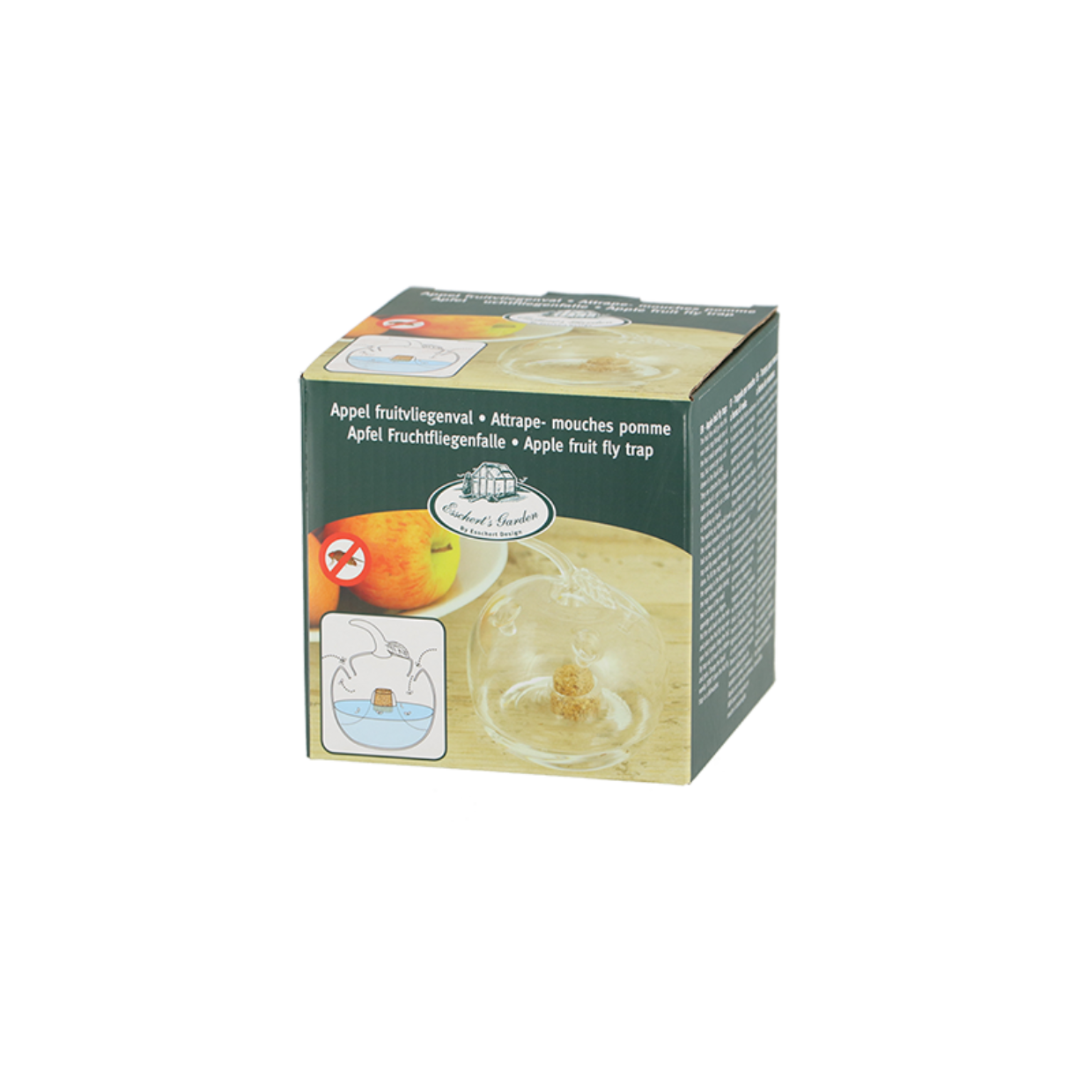 Dat fruitvliegen vervelend kunnen zijn weet iedereen. Vooral in de zomer komen deze vliegende insecten af op fruit in de keuken of kelder. Deze glazen fruitvliegenval biedt een niet giftige oplossing om deze te bestrijden. Plaats de transparante appel in de buurt van fruitschaal en doe een mengsel van verschillende vloeistoffen (water, azijn en een paar druppels afwasmiddel) in de val. De vliegen zullen door een van de vier kleine gaten aan de bovenkant proberen om bij het mengsel te komen. Eenmaal binnen in het glas kunnen ze er niet meer uitkomen.