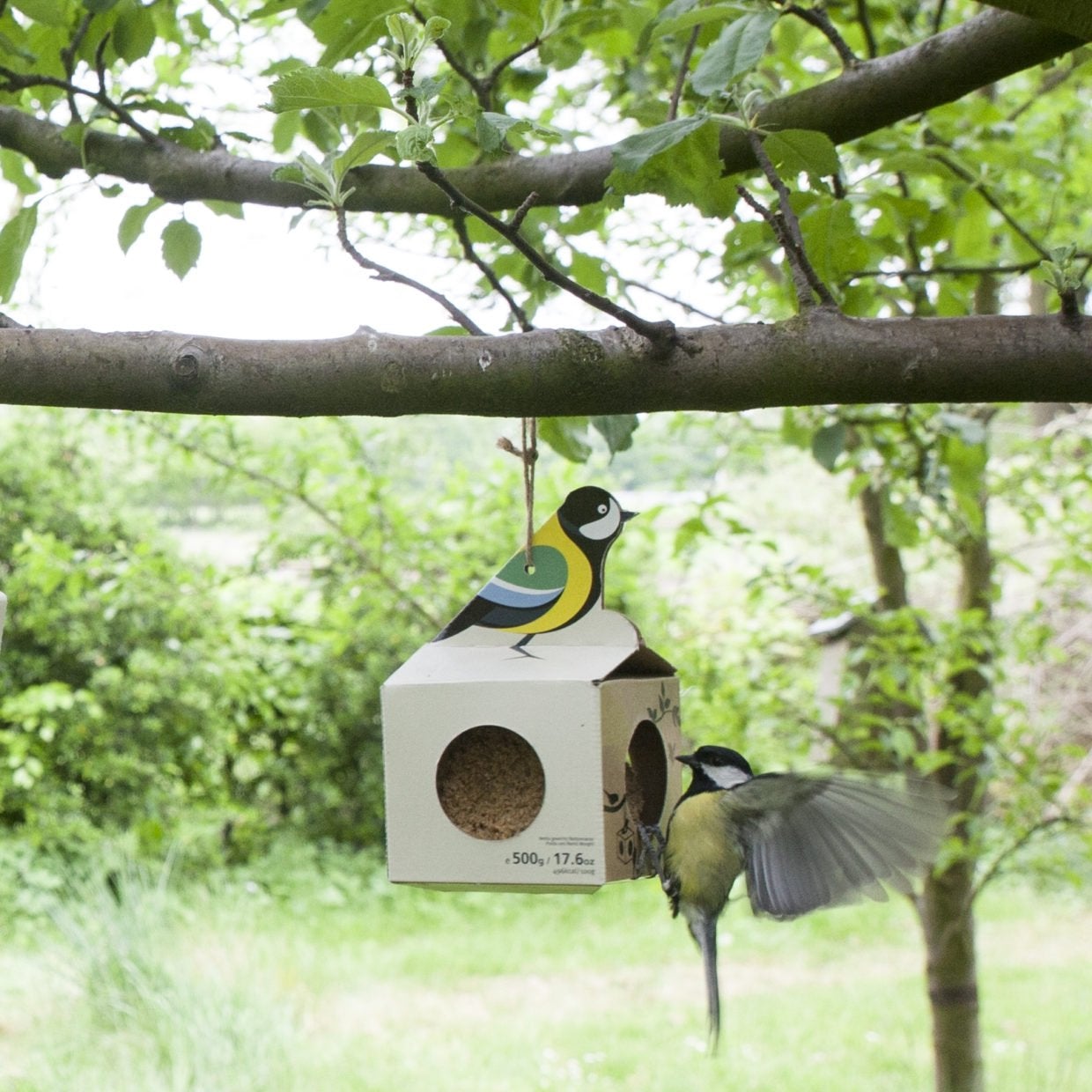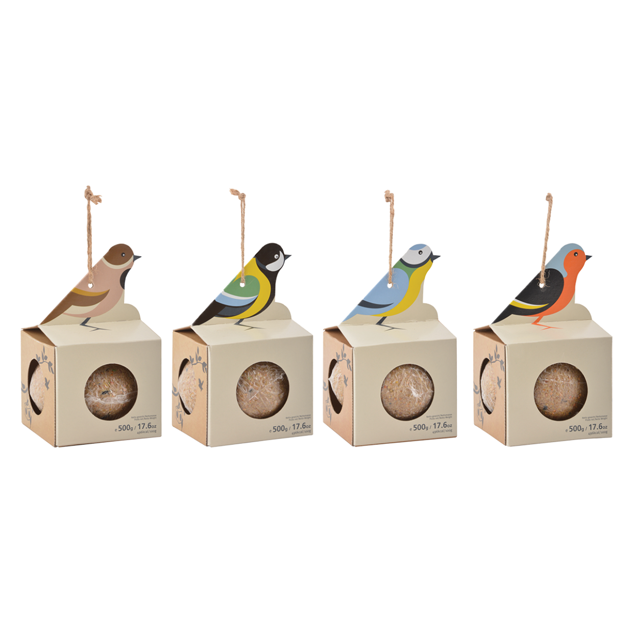 Deze vetbollenhouder met een reuze 500gr vetbol is al kant-en-klaar om direct in gebruik te worden genomen en opgehangen te worden. De vetbol zit reeds verpakt in deze vierkante kartonnen houder dat dankzij het koord bovendien erg eenvoudig op te hangen is in de tuin. De vier openingen bieden meerdere vogels tegelijk de mogelijkheid om bij de vetbol te komen. • assorti van 4 • gevuld met reuze 500g vetbol • inclusief natuurlijke jute touw • Prijs is 1 stuk er wordt een willekeurige kleur geleverd.