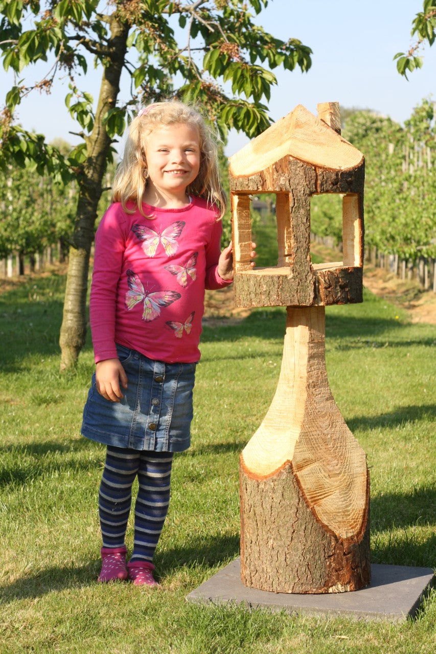 Vogelvoederhuisje, exclusief handwerk, uit een stam gezaagde vogelhuisjes van douglashout. Robuust / uniek / bijzonder. In iedere tuin een plaatje! Hoogte 120 cm, doorsnede: +/- 25-30 cm gewicht: +/-25-30kg