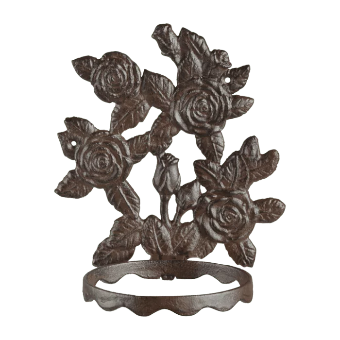 Gietijzeren bloempothouder met prachtige rozendecoratie als achtergrond. Handig om een pot met plant in te plaatsen. Zelfs als het plantje de winter niet overleeft heeft u toch een mooie gietijzeren decoratie aan de muur.