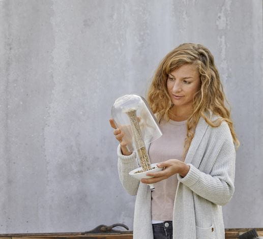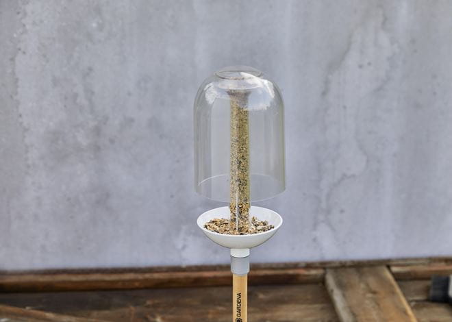 Het voerstation is eenvoudig te vullen met vogelzaad door de overkapping te verwijderen en het voer in de dispenser te doen.