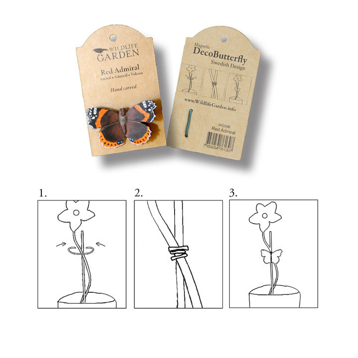 De ambachtelijk vervaardigde vlinders van Wildlife Garden kunnen binnen- en buitenshuis gebruikt worden ter decoratie. Door de magneet aan de achterzijde kunnen de vlinders bijvoorbeeld gebruikt worden als koelkastmagneten. Tevens kunnen de vlinders met het bijgeleverde draad gebruikt worden ter decoratie van bloemen en/of planten. Op het eerste gezicht zou u bij het zien van de Dagpauwoog denken dat u met een echte vlinder te maken heeft die elk moment zou kunnen wegvliegen op weg naar de volgende bloem. Onze vlinders vrolijken uw planten op, ook op het moment dat ze even niet in bloei staan. De DecoButterflies zijn een leuk cadeautje voor uzelf of voor anderen. De vlinders worden ambachtelijk vervaardigd van lindehout en met de hand beschilderd. De gebruikte verf is uiteraard milieuvriendelijk. De collectie bestaat op dit moment uit de volgende bekende Europese vlinders: Gehakkelde Aurea, Dagpauwoog, Ciroenvlinder, Rouwmantel, Boomblauwtje, Atalanta en de Koninginnenpage.