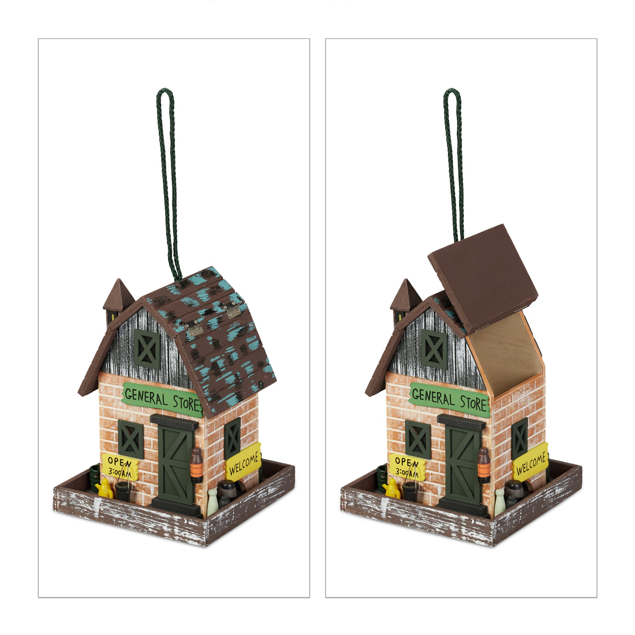 Met dit decoratie vogelhuisje haal je een echte eye catcher in huis. Het vogelhuis weet te overtuigen met zijn schitterende ontwerp in de vorm van een klein winkeltje en is een blikvanger in de tuin, op het balkon of op het terras. Het decoratieve huisje met dak om open te klappen is gemaakt van populieren- en grenenhout en kan opgehangen of neergezet worden. Bovendien is hij heel geschikt om cadeau te geven aan liefhebbers van decoratie en vogels.