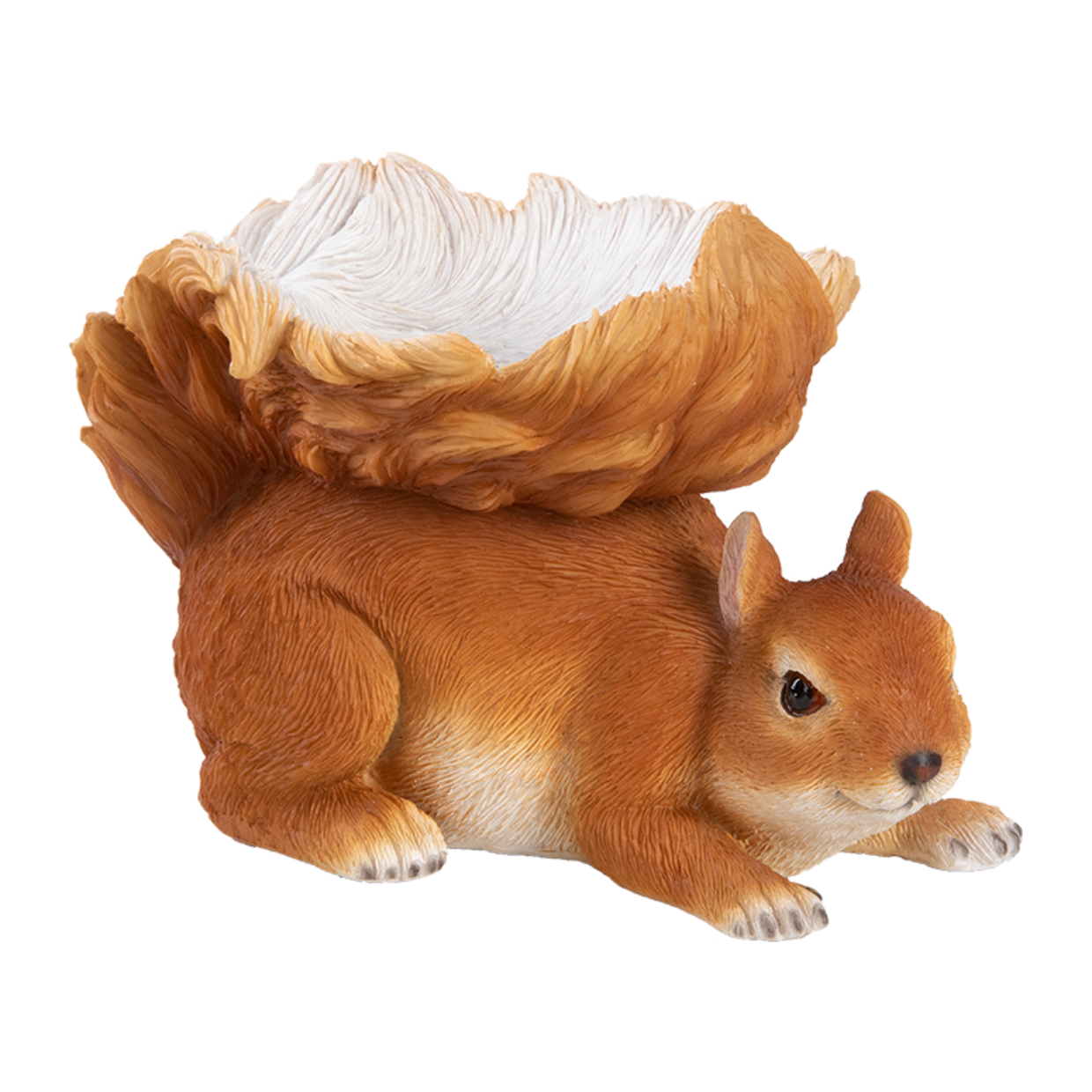 Deze voederschaal in de vorm van een eekhoorn is een eyecatcher in de tuin.
