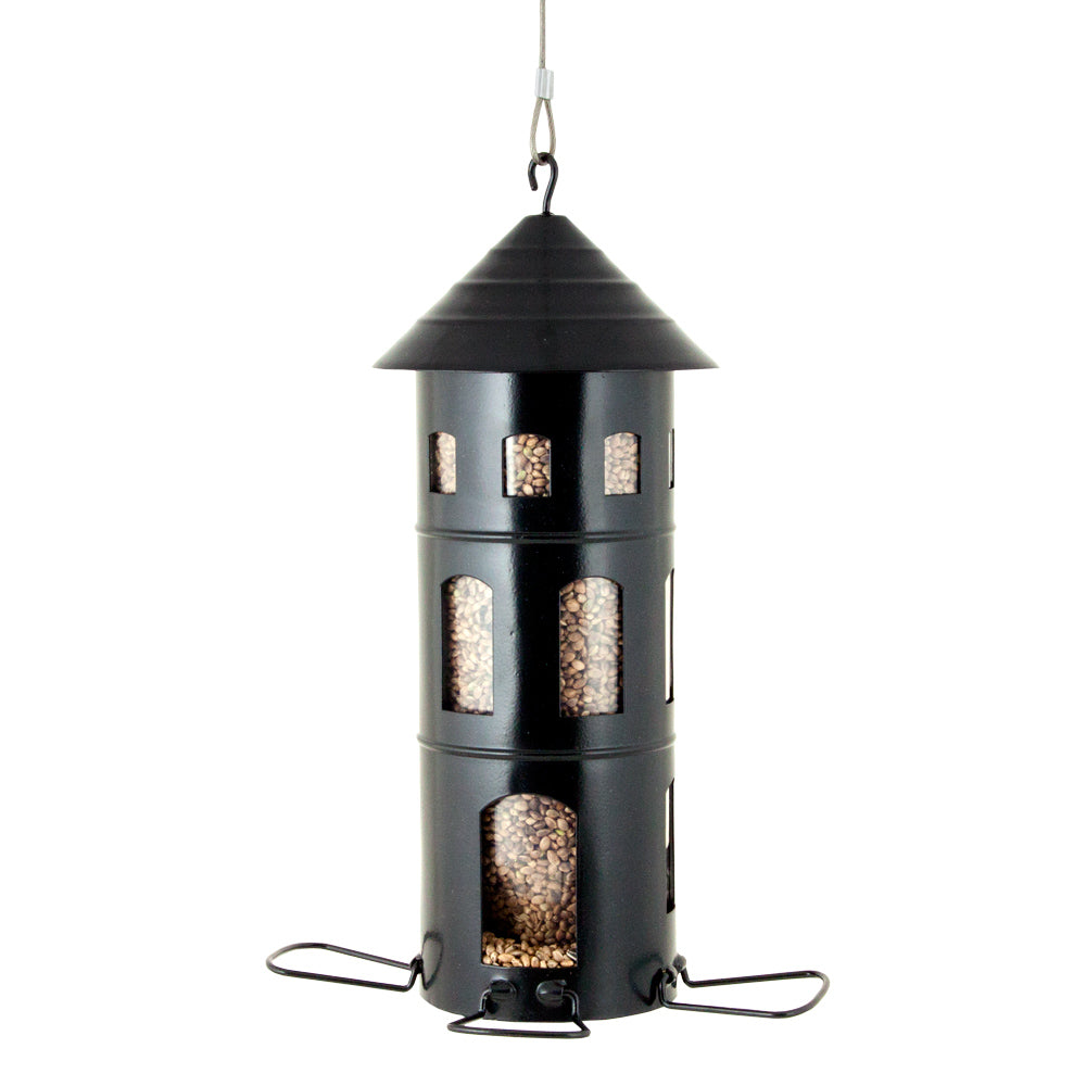 De Kombimatare Frö heeft een handige plastic inzetkoker die gevuld kan worden met vogelzaad of bijvoorbeeld zonnebloempitten. Aan de onderkant bevinden zich beugeltjes waarop de vogels zich tegoed kunnen doen aan het aangeboden voer. Het voederhuisje kan ook gebruikt worden zonder de plastic inzetkoker voor het aanbieden van bijvoorbeeld appels of vetbollen. Het ophangen van de ogelvoederautomaat De Kombimatare kan makkelijk opgehangen worden in een boom, aan een spijker of een haak met het bijgelverde ophangkoord. Hoe dichter bij het raam hoe beter het uitzicht! Aan te passen voor verschillende vogelsoorten Door het gebruik van de verschillende zitbeugels klein en groot kunnen verschillende vogels worden aangetrokken. Gewicht: 0,4 kg Kwaliteit: Gepoederlakt staal, Kunststof inzetkoker Afmeting: 110 x 110 x 255 mm Hoedanigheid: 1,2 l Montage: Ophangkoord