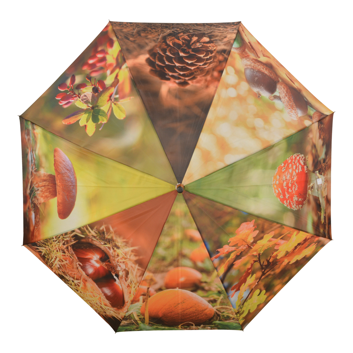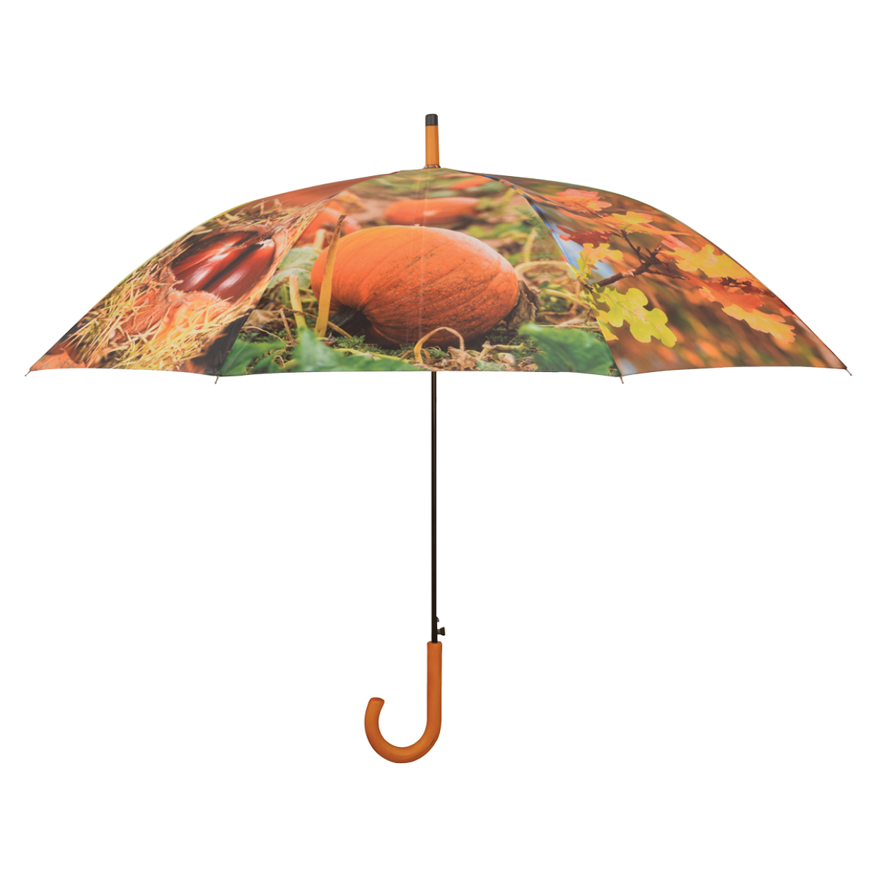 Paraplu met 8 verschillende herfsprints; pompoen, kastanje, paddenstoel, bessen, dennenappel en bladeren