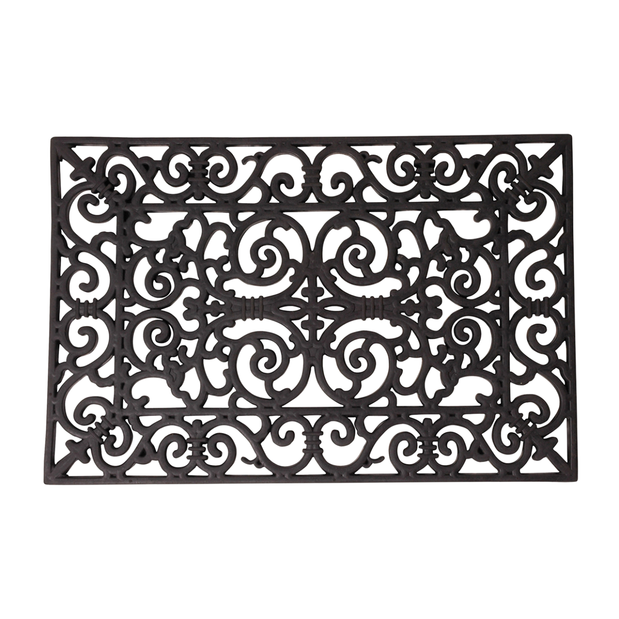 Deze rechthoekige rubberen deurmat is prachtig voor buiten of in huis. De rubbermat heeft een klassiek Victoriaans patroon met sierlijke krullen. Het voordeel van een compleet rubberen deurmat is dat hij zeer eenvoudig te reinigen is door de mat af te spoelen. Bovendien zorgt het materiaal ervoor dat de mat niet wegglijdt.