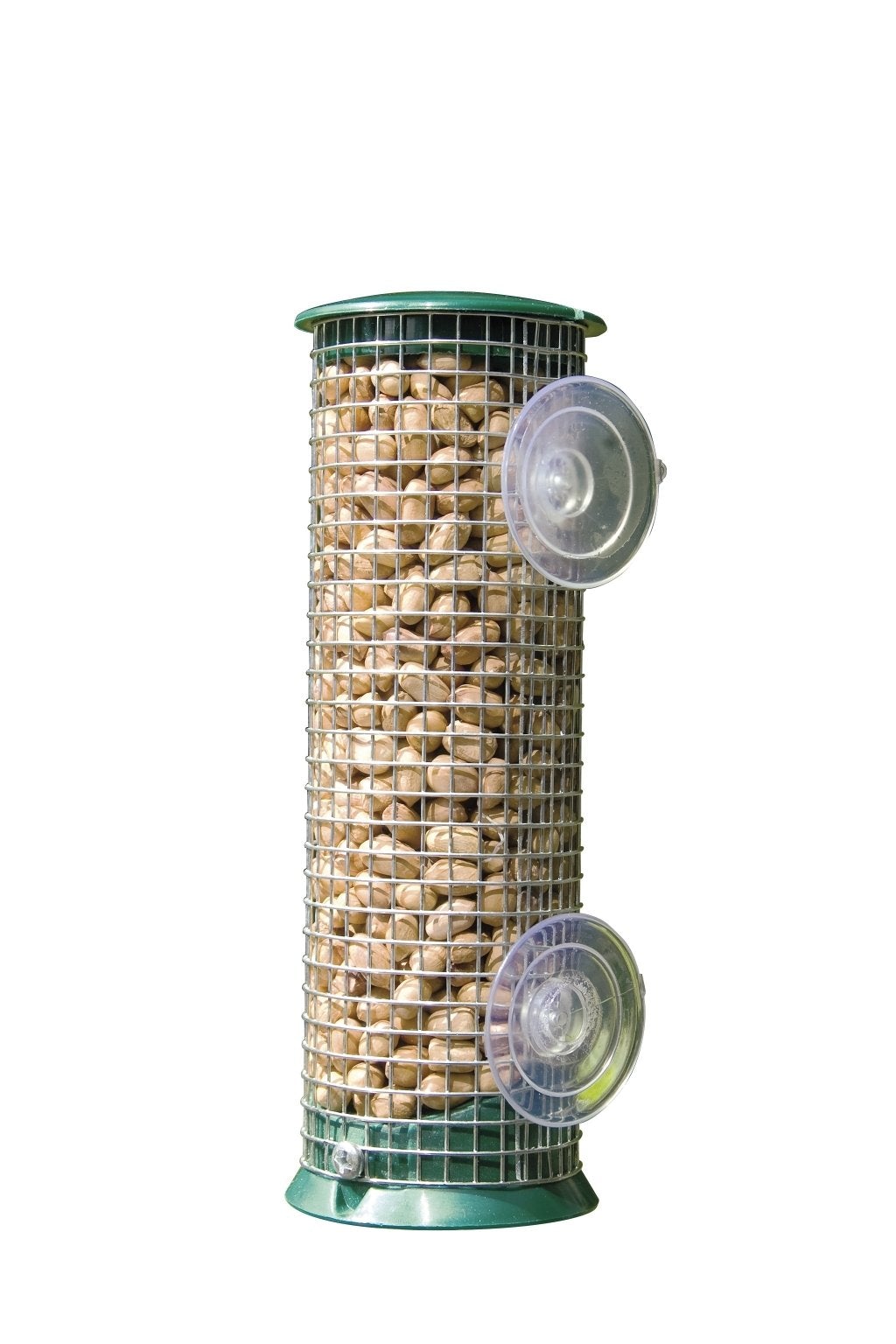 Deze pindasilo kan met zuignappen aan het raam worden bevestigd. De vogels pikken stukjes pinda door het gaas en u kunt ze van heel dichtbij bekijken.