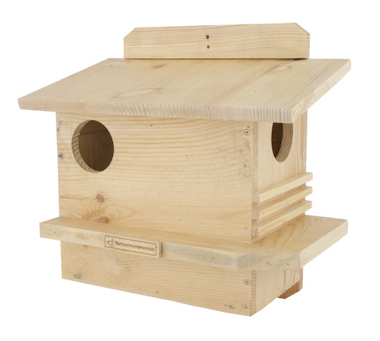 Dit product is ontwikkeld door Natuurmonumenten. Steeds meer leefgebieden voor eekhoorns verdwijnen. Door het plaatsen van een Eekhoorn woonhuis helpt u deze dieren een handje. Dit Eekhoorn woonhuis is voorzien van twee in- en uitgangen. Dit biedt de eekhoorn een snelle ontsnappingsmogelijkheid bij gevaar. Fraai vormgegeven, degelijk uitgevoerd in vurenhout en afgewerkt met een blanke lak op waterbasis. Hang het Eekhoorn woonhuis in een boom op een hoogte van 3-5 meter, de openingen niet naar zuidwesten gericht. Naast één hoofdnest heeft een eekhoorn vaak ook vijf tot zes kleinere ‘reservenesten’ in gebruik om te slapen, schuilen en kramen. Om het huis extra aantrekkelijk te maken kunt u er wat dorre bladeren, stro of dor gras in leggen.